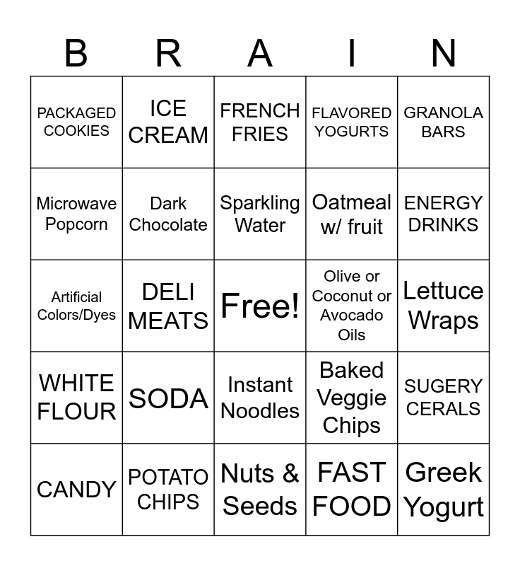 This bingo card has a free space and 24 words: SODA, POTATO CHIPS, Sparkling Water, CANDY, GRANOLA BARS, PACKAGED COOKIES, Microwave Popcorn, ICE CREAM, Olive or Coconut or Avocado Oils, Instant Noodles, Oatmeal w/ fruit, Artificial Colors/Dyes, Baked Veggie Chips, SUGERY CERALS, Dark Chocolate, FAST FOOD, Lettuce Wraps, FRENCH FRIES, ENERGY DRINKS, DELI MEATS, Greek Yogurt, WHITE FLOUR, FLAVORED YOGURTS and Nuts & Seeds.