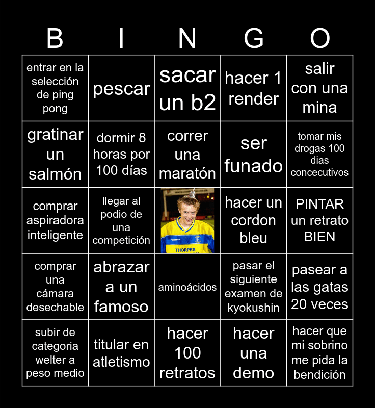This bingo card has a free space and 24 words: abrazar a un famoso, titular en atletismo, correr una maratón, subir de categoria welter a peso medio, salir con una mina, entrar en la selección de ping pong, gratinar un salmón, pescar, hacer un cordon bleu, aminoácidos, ser funado, comprar aspiradora inteligente, pasar el siguiente examen de kyokushin, pasear a las gatas 20 veces, dormir 8 horas por 100 días, hacer una demo, PINTAR un retrato BIEN, sacar un b2, tomar mis drogas 100 dias concecutivos, llegar al podio de una competición, hacer que mi sobrino me pida la bendición, comprar una cámara desechable, hacer 1 render and hacer 100 retratos.