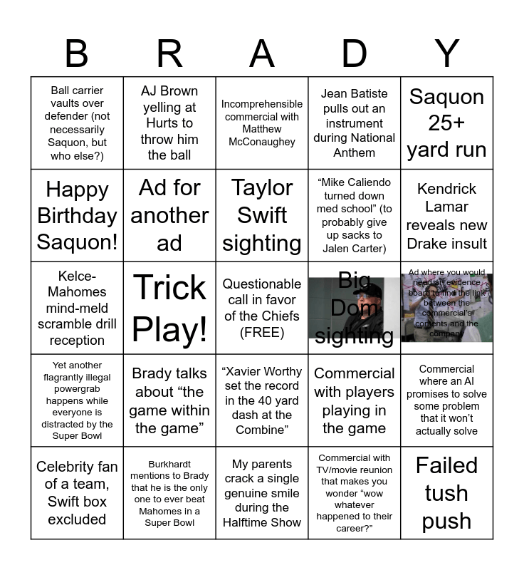 This bingo card has 2 images, a free space and 24 words: Brady talks about “the game within the game”, Burkhardt mentions to Brady that he is the only one to ever beat Mahomes in a Super Bowl, Taylor Swift sighting, Celebrity fan of a team, Swift box excluded, Saquon 25+ yard run, Ball carrier vaults over defender (not necessarily Saquon, but who else?), Happy Birthday Saquon!, AJ Brown yelling at Hurts to throw him the ball, Big Dom sighting, “Xavier Worthy set the record in the 40 yard dash at the Combine”, “Mike Caliendo turned down med school” (to probably give up sacks to Jalen Carter), Kelce-Mahomes mind-meld scramble drill reception, Commercial with players playing in the game, Commercial where an AI promises to solve some problem that it won’t actually solve, Ad for another ad, Commercial with TV/movie reunion that makes you wonder “wow whatever happened to their career?”, Ad where you would need an evidence board to find the link between the commercial’s contents and the company, Incomprehensible commercial with Matthew McConaughey, Kendrick Lamar reveals new Drake insult, Trick Play!, Failed tush push, Yet another flagrantly illegal powergrab happens while everyone is distracted by the Super Bowl, Jean Batiste pulls out an instrument during National Anthem and My parents crack a single genuine smile during the Halftime Show.
