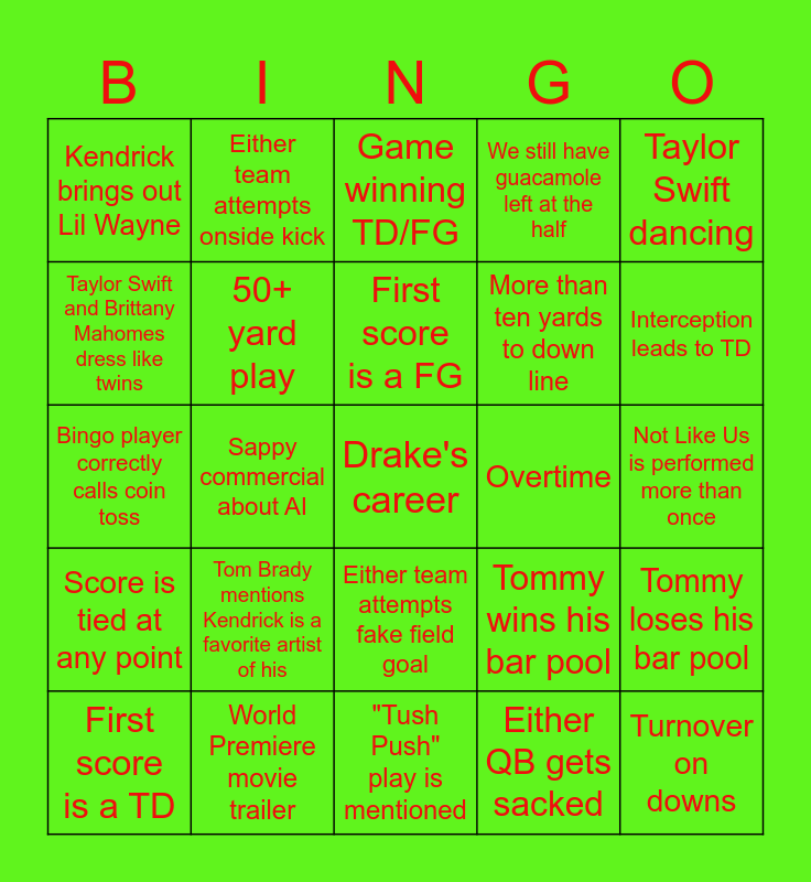 This bingo card has a free space and 24 words: Tom Brady mentions Kendrick is a favorite artist of his, World Premiere movie trailer, First score is a FG, First score is a TD, Taylor Swift dancing, Kendrick brings out Lil Wayne, Taylor Swift and Brittany Mahomes dress like twins, Either team attempts onside kick, Overtime, Either team attempts fake field goal, More than ten yards to down line, Bingo player correctly calls coin toss, Tommy wins his bar pool, Tommy loses his bar pool, 50+ yard play, Either QB gets sacked, Not Like Us is performed more than once, Game winning TD/FG, Interception leads to TD, Sappy commercial about AI, Turnover on downs, Score is tied at any point, We still have guacamole left at the half and "Tush Push" play is mentioned.