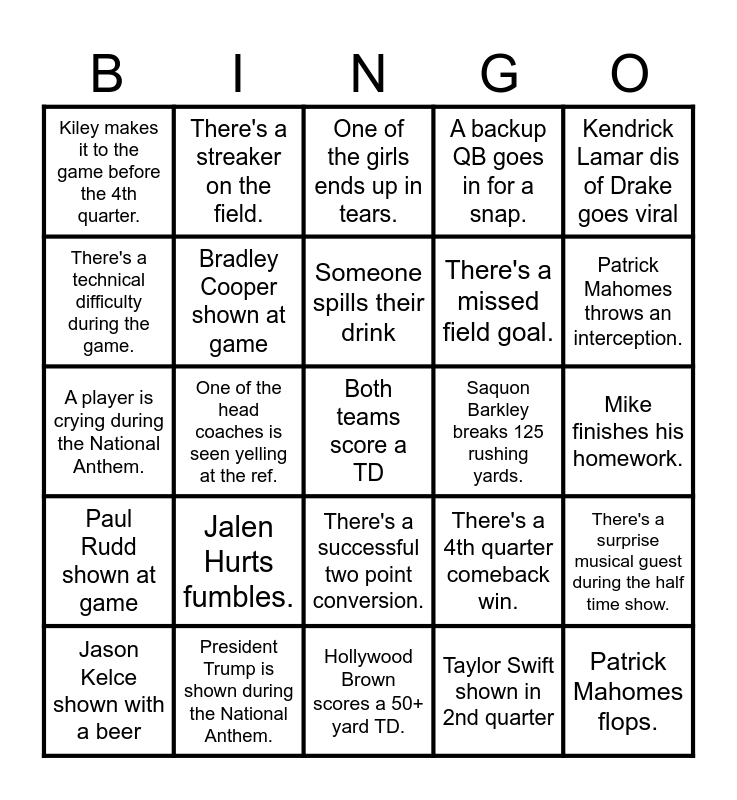 This bingo card has a free space and 34 words: Taylor Swift shown in 1st quarter, Taylor Swift shown in 2nd quarter, Taylor Swift shown in 3rd quarter, Taylor Swift shown in 4th quarter, Paul Rudd shown at game, Bradley Cooper shown at game, Kendrick Lamar dis of Drake goes viral, Jason Kelce shown with a beer, There's a streaker on the field., A retro ad is shown., Someone spills their drink, One of the girls ends up in tears., There's a successful tush push., Shot of a fan crying., Saquon Barkley breaks 125 rushing yards., Patrick Mahomes throws an interception., President Trump is shown during the National Anthem., A player is crying during the National Anthem., Jalen Hurts fumbles., There's a 4th quarter comeback win., There's a successful two point conversion., There's an illegal formation penalty., Kiley makes it to the game before the 4th quarter., Mike finishes his homework., Hollywood Brown scores a 50+ yard TD., Patrick Mahomes flops., A backup QB goes in for a snap., Someone other than a QB throws a pass., There's a missed field goal., There's a technical difficulty during the game., Patrick Mahomes makes a 15+ yard run for first down., One of the head coaches is seen yelling at the ref., There's a surprise musical guest during the half time show. and At the end of a quarter the scores are tied..