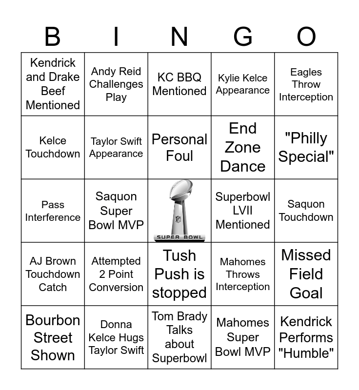 This bingo card has a free space and 24 words: Attempted 2 Point Conversion, Donna Kelce Hugs Taylor Swift, Personal Foul, Bourbon Street Shown, Eagles Throw Interception, Kendrick and Drake Beef Mentioned, Kelce Touchdown, Andy Reid Challenges Play, Superbowl LVII Mentioned, Tush Push is stopped, End Zone Dance, Pass Interference, Mahomes Throws Interception, Missed Field Goal, Taylor Swift Appearance, Mahomes Super Bowl MVP, Saquon Touchdown, KC BBQ Mentioned, "Philly Special", Saquon Super Bowl MVP, Kendrick Performs "Humble", AJ Brown Touchdown Catch, Kylie Kelce Appearance and Tom Brady Talks about Superbowl.