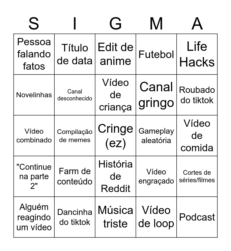 This bingo card has a free space and 24 words: Farm de conteúdo, Dancinha do tiktok, Vídeo de criança, Alguém reagindo um vídeo, Life Hacks, Pessoa falando fatos, Novelinhas, Título de data, Gameplay aleatória, História de Reddit, Canal gringo, Vídeo combinado, Vídeo engraçado, Cortes de séries/filmes, Canal desconhecido, Vídeo de loop, Vídeo de comida, Edit de anime, Roubado do tiktok, Compilação de memes, Podcast, "Continue na parte 2", Futebol and Música triste.
