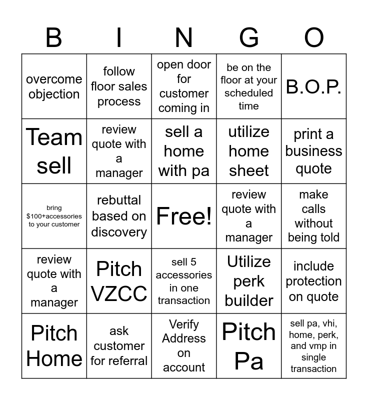 This bingo card has a free space and 24 words: Pitch Home, Pitch VZCC, sell a home with pa, Pitch Pa, B.O.P., overcome objection, follow floor sales process, open door for customer coming in, review quote with a manager, make calls without being told, bring $100+accessories to your customer, review quote with a manager, Utilize perk builder, include protection on quote, Team sell, ask customer for referral, Verify Address on account, be on the floor at your scheduled time, print a business quote, review quote with a manager, rebuttal based on discovery, sell 5 accessories in one transaction, utilize home sheet and sell pa, vhi, home, perk, and vmp in single transaction.