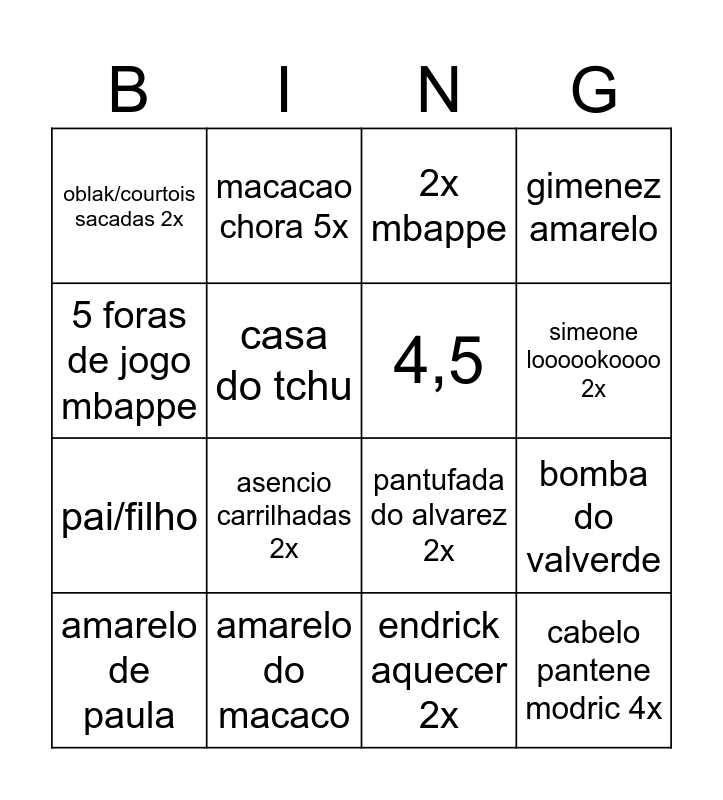 This bingo card has 16 words: amarelo de paula, amarelo do macaco, 2x mbappe, gimenez amarelo, 5 foras de jogo mbappe, macacao chora 5x, pantufada do alvarez 2x, bomba do valverde, oblak/courtois sacadas 2x, casa do tchu, endrick aquecer 2x, simeone loooookoooo 2x, pai/filho, asencio carrilhadas 2x, 4,5 and cabelo pantene modric 4x.