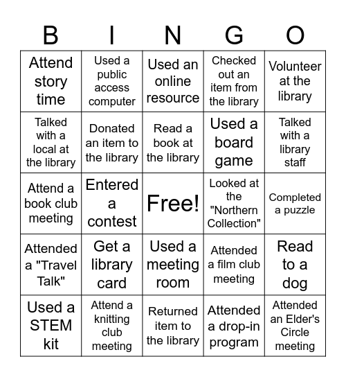 This bingo card has a free space and 24 words: Get a library card, Attend a knitting club meeting, Read a book at the library, Used a STEM kit, Volunteer at the library, Attend story time, Talked with a local at the library, Used a public access computer, Looked at the "Northern Collection", Used a meeting room, Used a board game, Attend a book club meeting, Attended a film club meeting, Read to a dog, Donated an item to the library, Attended a drop-in program, Completed a puzzle, Used an online resource, Talked with a library staff, Entered a contest, Attended an Elder's Circle meeting, Attended a "Travel Talk", Checked out an item from the library and Returned item to the library.