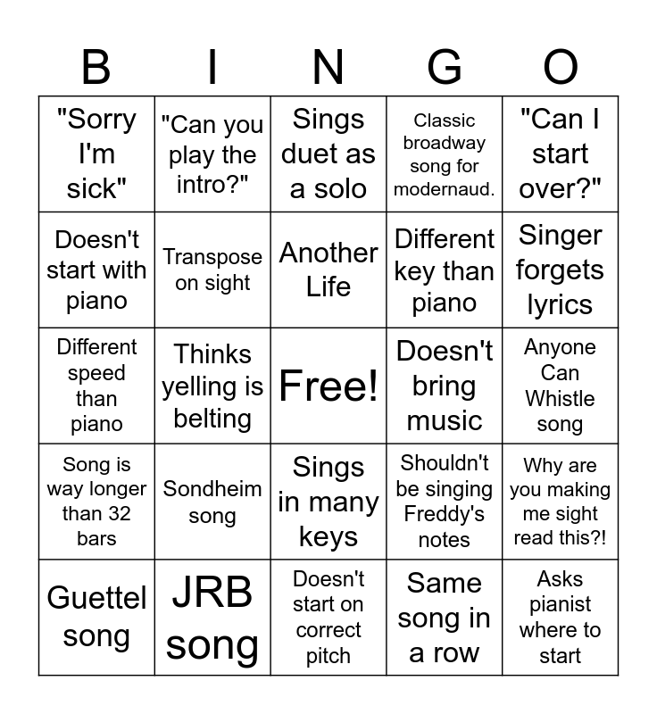 This bingo card has a free space and 24 words: Sondheim song, JRB song, Another Life, Guettel song, "Can I start over?", "Sorry I'm sick", Doesn't start with piano, "Can you play the intro?", Doesn't bring music, Sings in many keys, Different key than piano, Different speed than piano, Shouldn't be singing Freddy's notes, Why are you making me sight read this?!, Transpose on sight, Same song in a row, Anyone Can Whistle song, Sings duet as a solo, Singer forgets lyrics, Thinks yelling is belting, Asks pianist where to start, Song is way longer than 32 bars, Classic broadway song for modernaud. and Doesn't start on correct pitch.