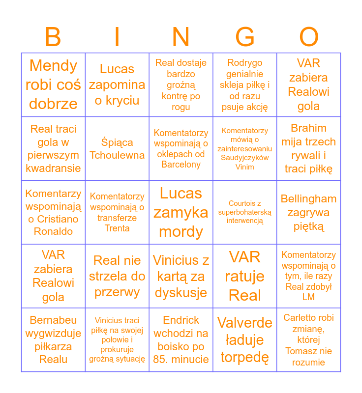 This bingo card has 28 words: Komentatorzy wspominają o tym, ile razy Real zdobył LM, Przynajmniej jeden piłkarz Realu nie gra na swojej naturalnej pozycji, Komentatorzy mówią o zainteresowaniu Saudyjczyków Vinim, Valverde ładuje torpedę, Real traci gola w pierwszym kwadransie, Real dostaje bardzo groźną kontrę po rogu, Lucas zapomina o kryciu, VAR zabiera Realowi gola, Courtois z superbohaterską interwencją, Bernabeu wygwizduje piłkarza Realu, Komentarzy wspominają o Cristiano Ronaldo, Rodrygo genialnie skleja piłkę i od razu psuje akcję, Vinicius traci piłkę na swojej połowie i prokuruje groźną sytuację, Endrick wchodzi na boisko po 85. minucie, Brahim mija trzech rywali i traci piłkę, Kylian na spalonym, Real nie strzela do przerwy, Śpiąca Tchoulewna, Komentatorzy wspominają o oklepach od Barcelony, Vinicius z kartą za dyskusje, Mendy robi coś dobrze, Carletto robi zmianę, której Tomasz nie rozumie, Lucas zamyka mordy, Komentatorzy wspominają o transferze Trenta, Bellingham zagrywa piętką, VAR ratuje Real, VAR zabiera Realowi gola and Przeciwnicy oklaskują Modricia.