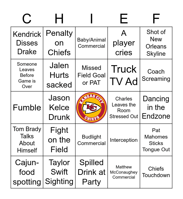 This bingo card has a free space and 24 words: Fight on the Field, Taylor Swift Sighting, Missed Field Goal or PAT, Cajun-food spotting, Shot of New Orleans Skyline, Kendrick Disses Drake, Someone Leaves Before Game is Over, Penalty on Chiefs, Charles Leaves the Room Stressed Out, Budlight Commercial, Truck TV Ad, Fumble, Interception, Pat Mahomes Sticks Tongue Out, Jalen Hurts sacked, Matthew McConaughey Commercial, Dancing in the Endzone, Baby/Animal Commercial, Coach Screaming, Jason Kelce Drunk, Chiefs Touchdown, Tom Brady Talks About Himself, A player cries and Spilled Drink at Party.