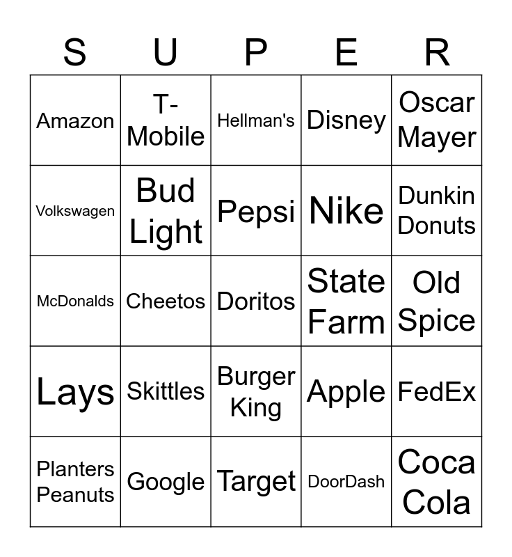 This bingo card has 40 words: Tide, Cheetos, Mr. Clean, Apple, Coca Cola, McDonalds, Bud Light, M&M's, Nike, FedEx, Amazon, T‐Mobile, Doritos, DoorDash, Old Spice, Volkswagen, Netflix, Hellman's, Budweiser, Oscar Mayer, Lays, Google, Pepsi, State Farm, Ford, Toyota, Pepsi, Pizza Hut, Snickers, Uber Eats, Mtn Dew, Skittles, Burger King, Verizon, Dunkin Donuts, Planters Peanuts, Dove, Target, Disney and Geico.