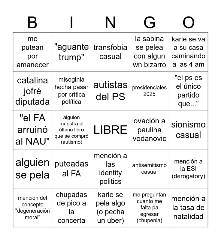 This bingo card has a free space and 24 words: puteadas al FA, chupadas de pico a la concerta, autistas del PS, mención del concepto "degeneración moral", karle se va a su casa caminando a las 4 am, me putean por amanecer, catalina jofré diputada, "aguante trump", ovación a paulina vodanovic, mención a las identity politics, presidenciales 2025, "el FA arruinó al NAU", antisemitismo casual, mención a la ESI (derogatory), misoginia hecha pasar por crítica política, me preguntan cuanto me falta pa egresar (chupenla), sionismo casual, transfobia casual, "el ps es el único partido que...", alguien muestra el último libro que se compró (autismo), mención a la tasa de natalidad, alguien se pela, la sabina se pelea con algun wn bizarro and karle se pela algo (o pecha un uber).