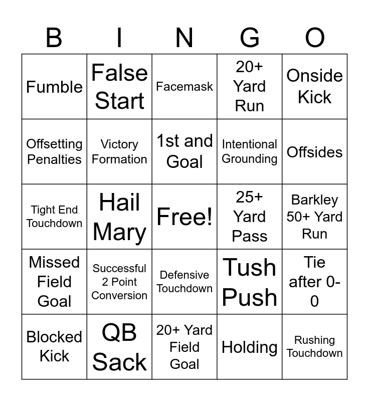 This bingo card has a free space and 44 words: Passing Touchdown, Rushing Touchdown, Punt, Blocked Kick, Pass Interference, Holding, Facemask, Booth Review/Challenge, Onside Kick, QB Sack, 20+ Yard Run, 25+ Yard Pass, Defensive Touchdown, Successful 2 Point Conversion, Made Extra Point, 20+ Yard Field Goal, 40+ Yard Field Goal, Tight End Touchdown, Taylor Swift Sighting, Offsides, False Start, Diving Catch, 35+ Yard Kick Return, Fumble, Interception, Barkley 50+ Yard Run, Delay of Game, 4th Down Conversion, Tush Push, Missed Field Goal, 3 and Out, Tie after 0-0, One Handed Catch, Safety, Hail Mary, Trick Play, Rushing 1st Down, Passing 1st Down, 1st and Goal, Offsetting Penalties, Intentional Grounding, Player's Helmet comes off, Victory Formation and Double digit Lead.
