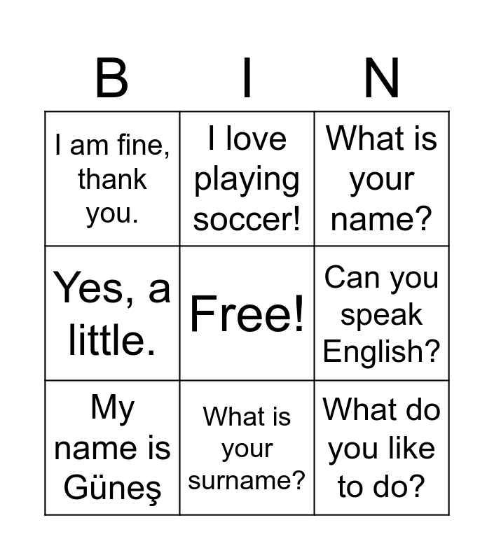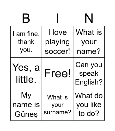 This bingo card has a free space and 30 words: Hello! Hi!, What nationality are you?, I am Turkish., How are you?, I am fine, thank you., What is your name?, My name is Güneş, Nice to meet you., Where are you from?, I am from Türkiye., How old are you?, I am 10 years old., Where do you live?, I live in Edirne, What is your favorite color?, My favorite color is blue., Do you have a pet?, I have a cat., I don’t have a pet., What do you like to do?, I like swimming, Do you like music?, I love playing soccer!, I don’t like basketball., Can you speak English?, Yes, a little., I can’t speak English, My hobby is reading books., What is your surname? and See you later!.