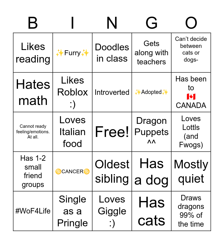 This bingo card has a free space and 24 words: ♋️CANCER♋️, Single as a Pringle, Introverted, #WoF4Life, Can’t decide between cats or dogs-, Likes reading, Hates math, ✨Furry✨, Dragon Puppets ^^, Oldest sibling, ✨Adopted✨, Cannot ready feeling/emotions. At all., Has a dog, Mostly quiet, Likes Roblox :), Has cats, Loves Lottls (and Fwogs), Doodles in class, Has been to 🇨🇦CANADA, Loves Italian food, Draws dragons 99% of the time, Has 1-2 small friend groups, Gets along with teachers and Loves Giggle :).