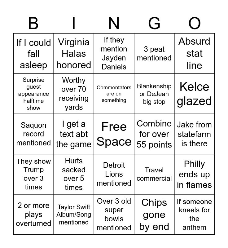 This bingo card has a free space and 24 words: Hurts sacked over 5 times, Taylor Swift Album/Song mentioned, Commentators are on something, 2 or more plays overturned, Absurd stat line, If I could fall asleep, Surprise guest appearance halftime show, Virginia Halas honored, Combine for over 55 points, Detroit Lions mentioned, Blankenship or DeJean big stop, Saquon record mentioned, Travel commercial, Philly ends up in flames, Worthy over 70 receiving yards, Chips gone by end, Jake from statefarm is there, If they mention Jayden Daniels, Kelce glazed, I get a text abt the game, If someone kneels for the anthem, They show Trump over 3 times, 3 peat mentioned and Over 3 old super bowls mentioned.