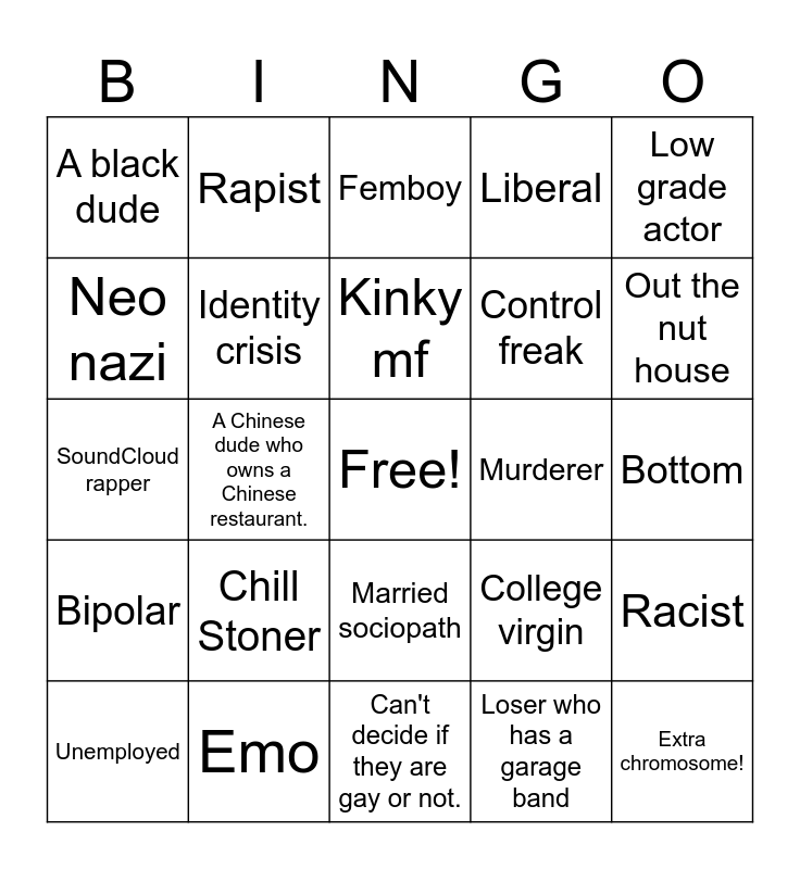 This bingo card has a free space and 24 words: Chill Stoner, Emo, Kinky mf, Unemployed, Low grade actor, A black dude, Neo nazi, Rapist, Murderer, Married sociopath, Control freak, SoundCloud rapper, College virgin, Racist, Identity crisis, Loser who has a garage band, Bottom, Femboy, Out the nut house, A Chinese dude who owns a Chinese restaurant., Extra chromosome!, Bipolar, Liberal and Can't decide if they are gay or not..