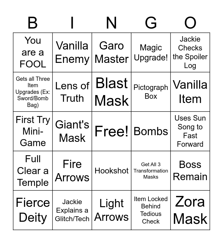 This bingo card has a free space and 43 words: Goron Mask, Zora Mask, Deku Mask, Fierce Deity, Jackie Has to Bomb Hover Somewhere, Item Locked Behind Tedious Check, Garo Master, Cheese a Boss Fight, Jackie Checks the Spoiler Log, Jackie Explains a Glitch/Tech, Magic Upgrade!, Bombs, Hookshot, Fire Arrows, Ice Arrows, Light Arrows, Bow, First Try Mini-Game, Someone Asks "is this a randomizer", Vanilla Item, Vanilla Enemy, Terrible Sound Randomizer, Fitting Song!, You are a FOOL, Useless Sidequest Reward, Uses Sun Song to Fast Forward, Complete a Whole Row of Masks, Bunny Hood, Get All 3 Transformation Masks, Full Clear a Temple, Oats to Order, Boss Remain, Chateau Romani, Giant's Mask, Great Fairy Sword, Shoot Twinmold, Enemy Causes Game Lag, Blast Mask, Gets all Three Item Upgrades (Ex: Sword/Bomb Bag), Pictograph Box, Elegy of Emptiness, Lens of Truth and Great Fairy Mask.