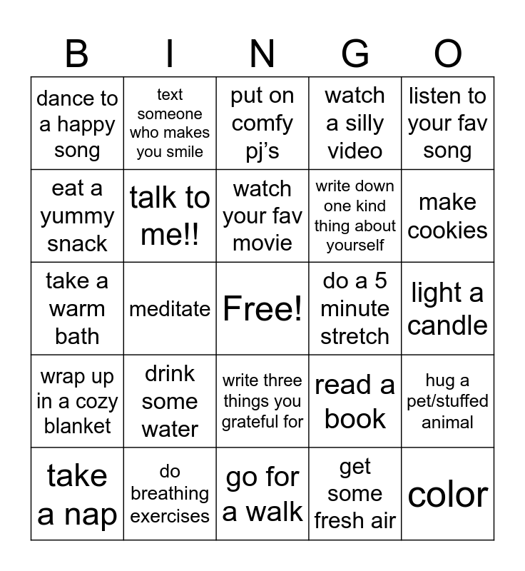 This bingo card has a free space and 24 words: drink some water, do breathing exercises, watch your fav movie, take a nap, listen to your fav song, dance to a happy song, eat a yummy snack, text someone who makes you smile, do a 5 minute stretch, write three things you grateful for, write down one kind thing about yourself, take a warm bath, read a book, hug a pet/stuffed animal, talk to me!!, get some fresh air, light a candle, put on comfy pj’s, make cookies, meditate, color, wrap up in a cozy blanket, watch a silly video and go for a walk.