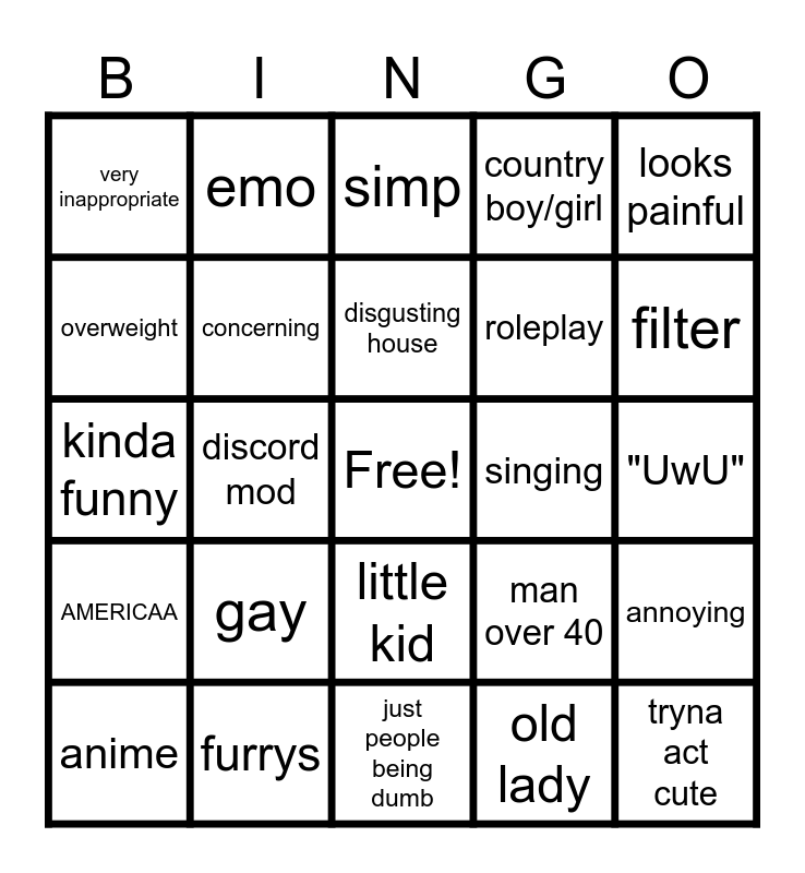 This bingo card has a free space and 24 words: gay, furrys, disgusting house, anime, looks painful, very inappropriate, overweight, emo, singing, little kid, roleplay, kinda funny, man over 40, annoying, concerning, old lady, "UwU", simp, filter, discord mod, tryna act cute, AMERICAA, country boy/girl and just people being dumb.