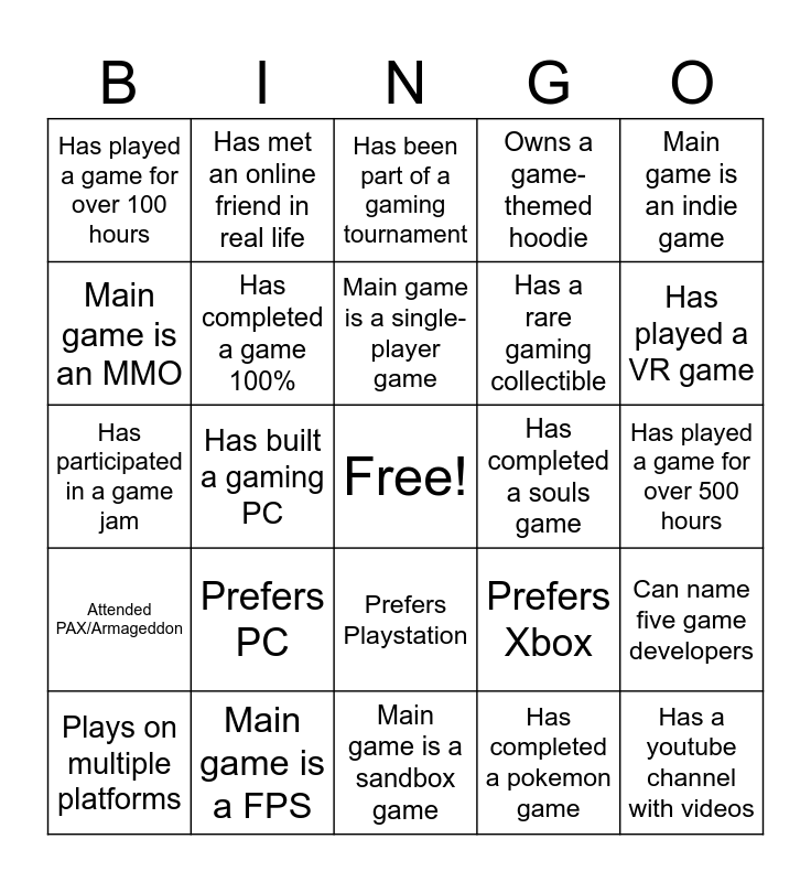 This bingo card has a free space and 33 words: Main game is a RPGs, Owns more than 50 games, Has built a gaming PC, Attended a gaming event, Attended PAX/Armageddon, Has completed a game 100%, Main game is an indie game, Plays on multiple platforms, Has met an online friend in real life, Streams on Twitch or YouTube, Main game is a single-player game, Has been part of a gaming tournament, Has pulled an all-nighter gaming, Main game is a strategy game, Has completed a souls game, Has played a VR game, Main game is a FPS, Has participated in a game jam, Prefers PC, Prefers Xbox, Prefers Playstation, Prefers Nintendo, Has played a game for over 100 hours, Has played a game for over 500 hours, Main game is a sandbox game, Has a youtube channel with videos, Owns a game-themed hoodie, Has a rare gaming collectible, Main game is an MMO, Can name five game developers, Main game is a turn-based game, Has completed a pokemon game and hit a high elo.
