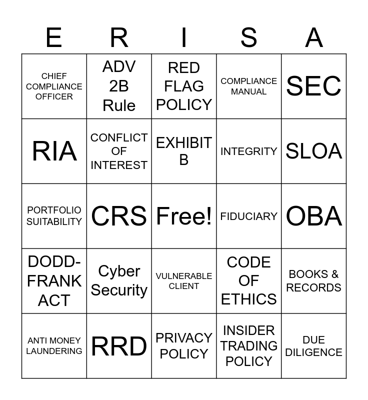 This bingo card has a free space and 24 words: Cyber Security, RRD, EXHIBIT B, ANTI MONEY LAUNDERING, SEC, CHIEF COMPLIANCE OFFICER, RIA, ADV 2B Rule, FIDUCIARY, VULNERABLE CLIENT, INTEGRITY, PORTFOLIO SUITABILITY, CODE OF ETHICS, BOOKS & RECORDS, CONFLICT OF INTEREST, INSIDER TRADING POLICY, OBA, RED FLAG POLICY, SLOA, CRS, DUE DILIGENCE, DODD-FRANK ACT, COMPLIANCE MANUAL and PRIVACY POLICY.