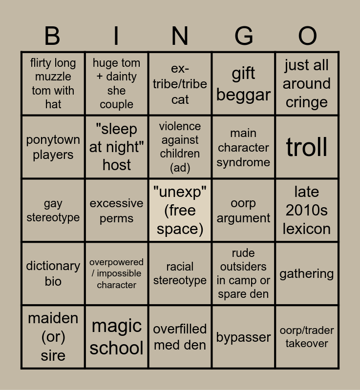 This bingo card has a free space and 39 words: sexism, long, unusual name, foreign language (eng serv), "sleep at night" host, maiden (or) sire, racial stereotype, violence against children (ad), high rank auditions, just all around cringe, dictionary bio, excessive perms, gift beggar, oorp/trader takeover, late 2010s lexicon, oorp argument, overpowered / impossible character, kit outside of camp, flirty long muzzle tom with hat, random fat insult, rude outsiders in camp or spare den, ponytown players, overfilled med den, main character syndrome, troll, ableism, blatantly obvious forbid, clan profusely defending outsider, obvious media character is catified, clan swaps, huge tom + dainty she couple, luna mention, apprentice > warrior ratio, ex-tribe/tribe cat, magic school, bypasser, beach roleplay, gathering, gay stereotype and atrocious spelling.