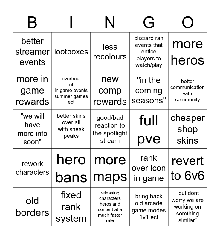 This bingo card has a free space and 24 words: hero bans, fixed rank system, new comp rewards, old borders, more heros, better streamer events, more in game rewards, lootboxes, full pve, more maps, "in the coming seasons", "we will have more info soon", rank over icon in game, revert to 6v6, overhaul of in game events summer games ect, bring back old arcade game modes 1v1 ect, cheaper shop skins, less recolours, better communication with community, better skins over all with sneak peaks, "but dont worry we are working on somthing similar", rework characters, blizzard ran events that entice players to watch/play and releasing characters heros and content at a much faster rate.