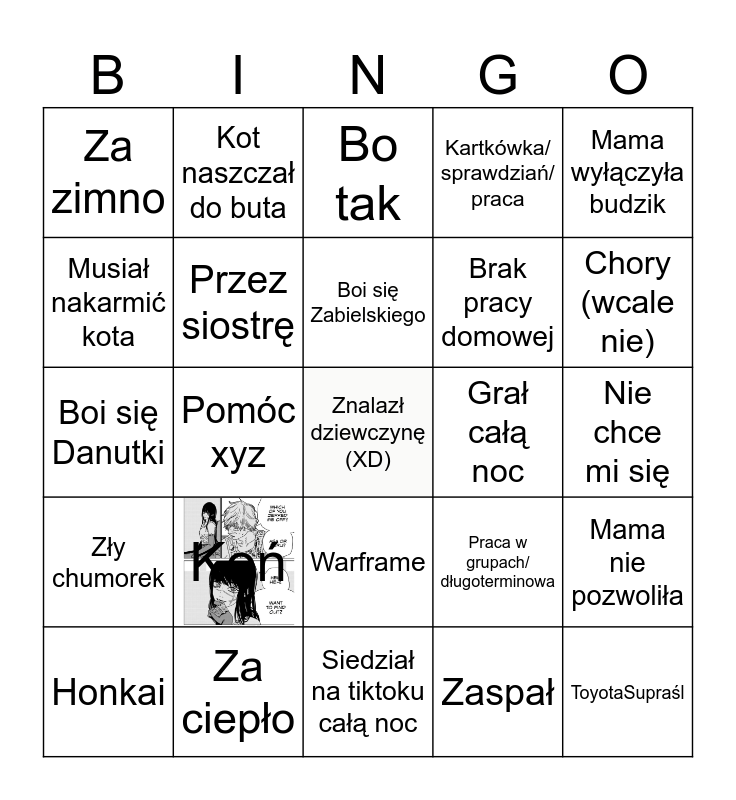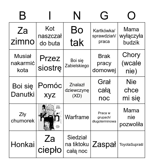 This bingo card has 1 images and 25 words: Koń, Siedział na tiktoku całą noc, Boi się Zabielskiego, Honkai, Mama wyłączyła budzik, Za zimno, Musiał nakarmić kota, Kot naszczał do buta, Grał całą noc, Warframe, Brak pracy domowej, Boi się Danutki, Praca w grupach/ długoterminowa, Mama nie pozwoliła, Przez siostrę, ToyotaSupraśl, Nie chce mi się, Bo tak, Chory (wcale nie), Pomóc xyz, Znalazł dziewczynę (XD), Za ciepło, Zły chumorek, Kartkówka/ sprawdziań/ praca and Zaspał.