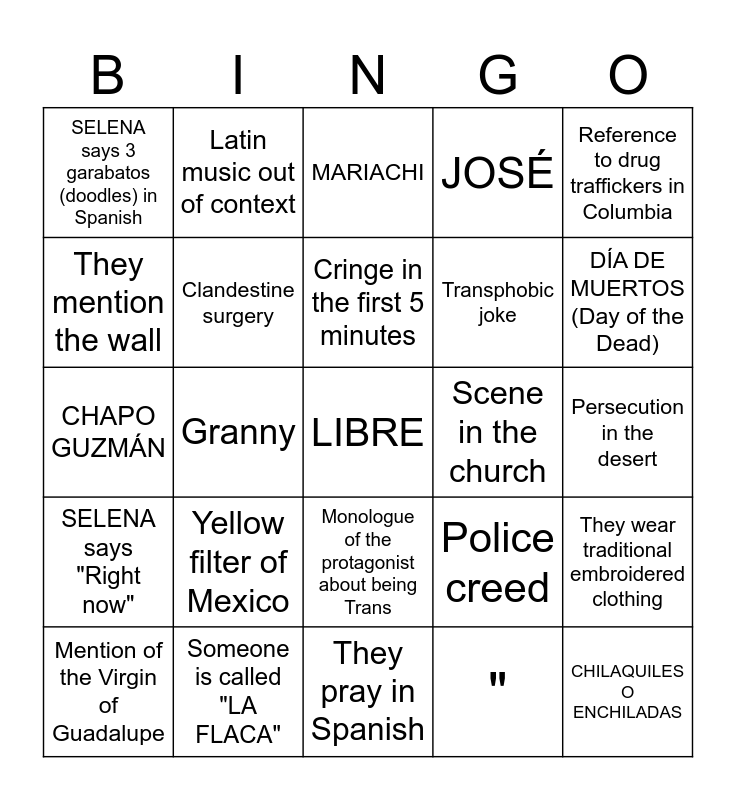 This bingo card has a free space and 25 words: Yellow filter of Mexico, They pray in Spanish, Cringe in the first 5 minutes, Mention of the Virgin of Guadalupe, Reference to drug traffickers in Columbia, SELENA says 3 garabatos (doodles) in Spanish, They mention the wall, Latin music out of context, Scene in the church, Monologue of the protagonist about being Trans, Transphobic joke, CHAPO GUZMÁN, Police creed, They wear traditional embroidered clothing, Clandestine surgery, SHOT DE TEQUILA, Persecution in the desert, MARIACHI, DÍA DE MUERTOS (Day of the Dead), Granny, CHILAQUILES O ENCHILADAS, Someone is called "LA FLACA", SELENA says "Right now", JOSÉ and ".