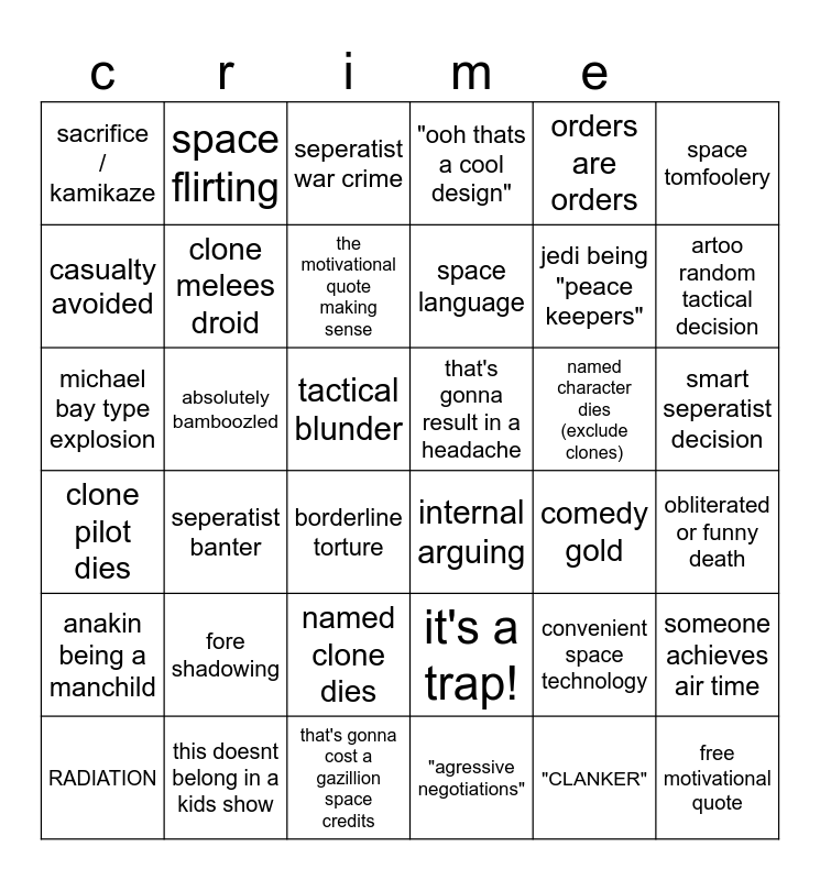 This bingo card has 42 words: "CLANKER", clone melees droid, smart republic decision, named character dies (exclude clones), obliterated or funny death, seperatist banter, michael bay type explosion, republic commits war crime, seperatist war crime, smart seperatist decision, tactical blunder, space language, artoo random tactical decision, orders are orders, this doesnt belong in a kids show, clone pilot dies, someone achieves air time, jedi being "peace keepers", free motivational quote, space flirting, space tomfoolery, named clone dies, anakin being a manchild, sacrifice / kamikaze, space stereotype, RADIATION, the motivational quote making sense, roid rage, fore shadowing, convenient space technology, unasked for insult, that's gonna result in a headache, casualty avoided, comedy gold, that's gonna cost a gazillion space credits, borderline torture, internal arguing, absolutely bamboozled, it's a trap!, "agressive negotiations", "ooh thats a cool design" and sassy remark.