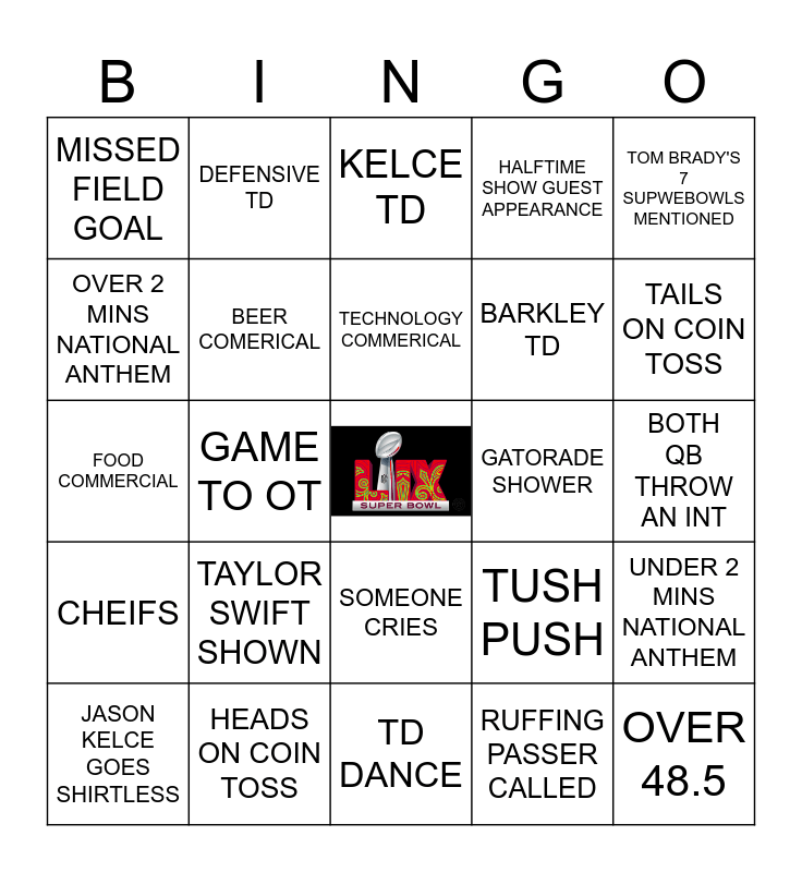 This bingo card has a free space and 24 words: TAYLOR SWIFT SHOWN, HEADS ON COIN TOSS, TECHNOLOGY COMMERICAL, JASON KELCE GOES SHIRTLESS, TOM BRADY'S 7 SUPWEBOWLS MENTIONED, MISSED FIELD GOAL, OVER 2 MINS NATIONAL ANTHEM, DEFENSIVE TD, GATORADE SHOWER, SOMEONE CRIES, BARKLEY TD, FOOD COMMERCIAL, TUSH PUSH, UNDER 2 MINS NATIONAL ANTHEM, BEER COMERICAL, RUFFING PASSER CALLED, BOTH QB THROW AN INT, KELCE TD, TAILS ON COIN TOSS, GAME TO OT, OVER 48.5, CHEIFS, HALFTIME SHOW GUEST APPEARANCE and TD DANCE.