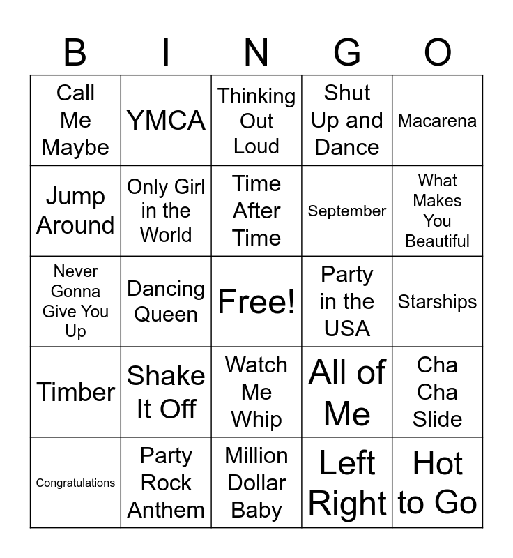 This bingo card has a free space and 35 words: Ms. Jackson, Whistle, Yeah!, Only Girl in the World, Watch Me Whip, Shut Up and Dance, Jump Around, Apple Bottom Jeans, Time After Time, Perfect, Never Gonna Give You Up, Macarena, Beat It, Cotton Eye Joe, Call Me Maybe, Party in the USA, Left Right, Dancing Queen, Timber, Hot to Go, All of Me, Congratulations, Cha Cha Slide, Party Rock Anthem, Thinking Out Loud, What Makes You Beautiful, Stay, Fien, September, Starships, Uptown Funk, Million Dollar Baby, Shake It Off, YMCA and Hey Ya.
