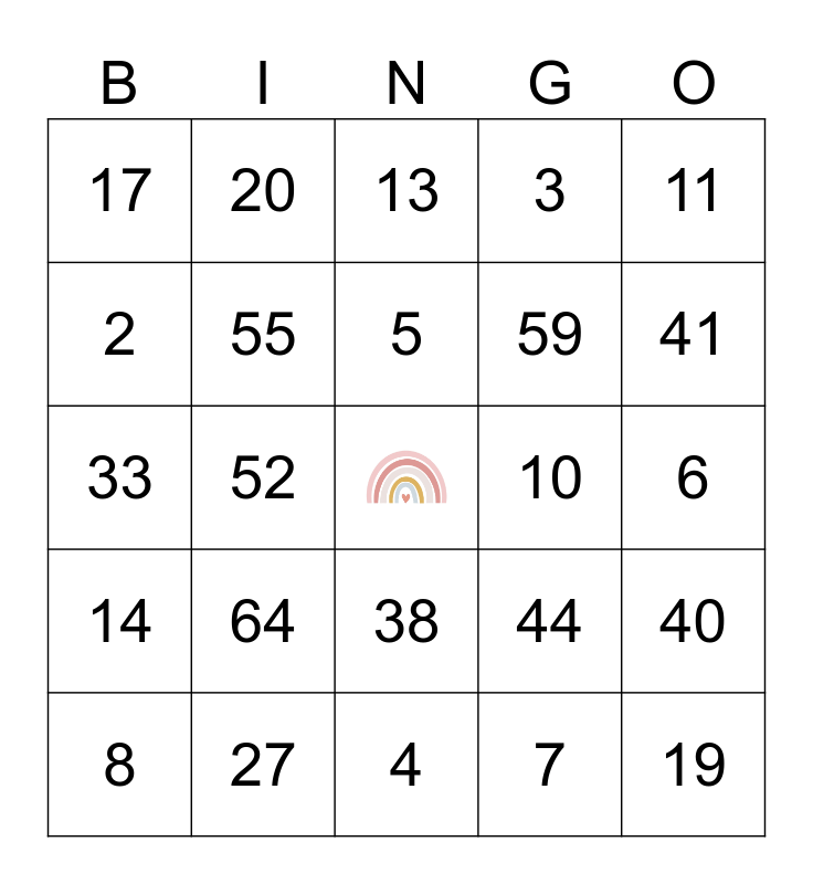 This bingo card has a free space and 29 words: 8, 23, 52, 30, 17, 13, 55, 64, 10, 27, 6, 19, 4, 7, 41, 60, 38, 14, 11, 33, 44, 21, 59, 2, 3, 20, 40, 5 and 48.