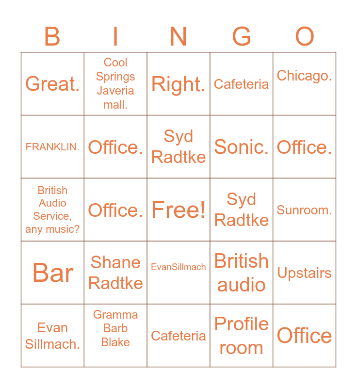 This bingo card has a free space and 24 words: Shane Radtke, Gramma Barb Blake, Syd Radtke, Evan Sillmach., Chicago., Great., FRANKLIN., Cool Springs Javeria mall., Syd Radtke, EvanSillmach, Sonic., British Audio Service, any music?, British audio, Upstairs, Office., Profile room, Sunroom., Right., Office., Office., Office, Bar, Cafeteria and Cafeteria.