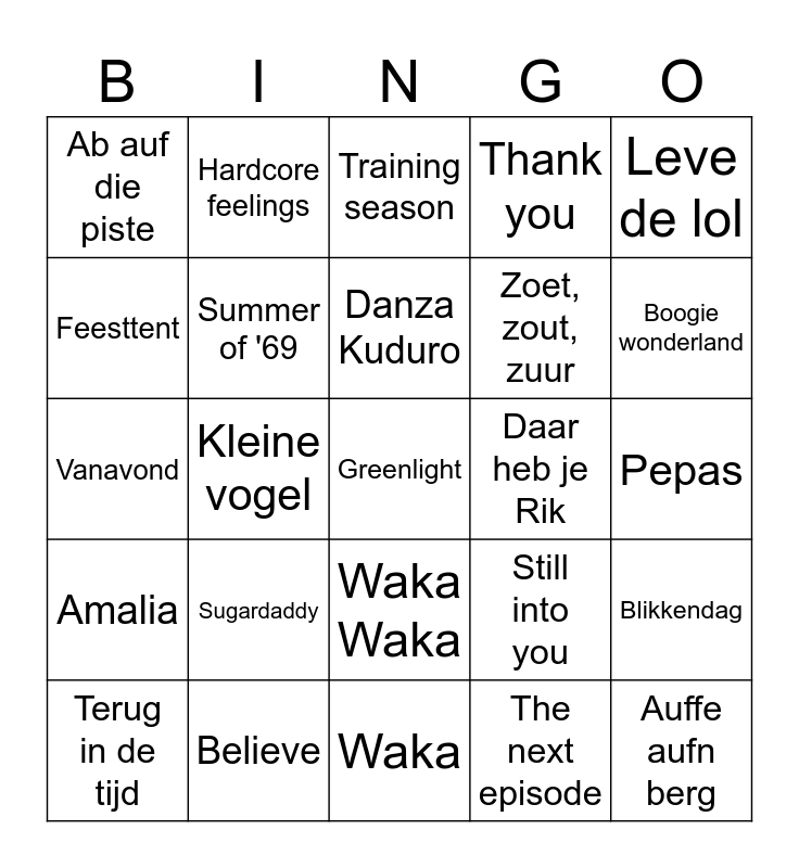 This bingo card has 25 words: Sugardaddy, Waka, Danza Kuduro, Terug in de tijd, Leve de lol, Ab auf die piste, Feesttent, Hardcore feelings, Daar heb je Rik, Waka Waka, Zoet, zout, zuur, Vanavond, Still into you, Blikkendag, Summer of '69, Auffe aufn berg, Pepas, Training season, Boogie wonderland, Kleine vogel, Greenlight, Believe, Amalia, Thank you and The next episode.