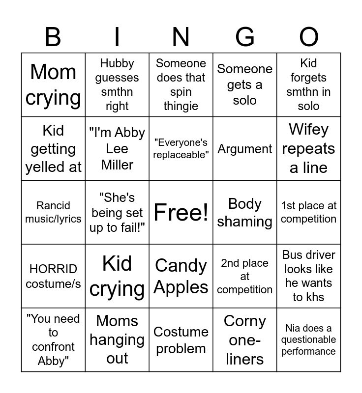 This bingo card has a free space and 24 words: Kid crying, Moms hanging out, "Everyone's replaceable", "You need to confront Abby", Kid forgets smthn in solo, Mom crying, Kid getting yelled at, Hubby guesses smthn right, Body shaming, Candy Apples, Argument, Rancid music/lyrics, 2nd place at competition, Bus driver looks like he wants to khs, "I'm Abby Lee Miller, Corny one-liners, 1st place at competition, Someone does that spin thingie, Wifey repeats a line, "She's being set up to fail!", Nia does a questionable performance, HORRID costume/s, Someone gets a solo and Costume problem.