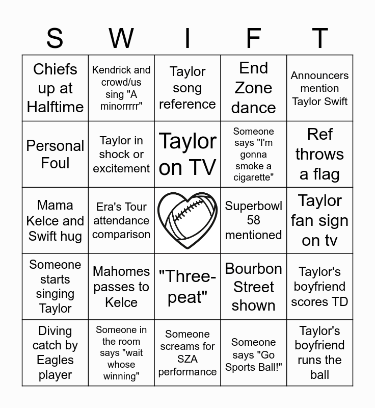 This bingo card has a free space and 24 words: Mahomes passes to Kelce, Someone in the room says "wait whose winning", Taylor on TV, Diving catch by Eagles player, Announcers mention Taylor Swift, Chiefs up at Halftime, Personal Foul, Kendrick and crowd/us sing "A minorrrrr", Superbowl 58 mentioned, "Three-peat", Someone says "I'm gonna smoke a cigarette", Mama Kelce and Swift hug, Bourbon Street shown, Taylor's boyfriend scores TD, Taylor in shock or excitement, Someone says "Go Sports Ball!", Taylor fan sign on tv, Taylor song reference, Ref throws a flag, Era's Tour attendance comparison, Taylor's boyfriend runs the ball, Someone starts singing Taylor, End Zone dance and Someone screams for SZA performance.