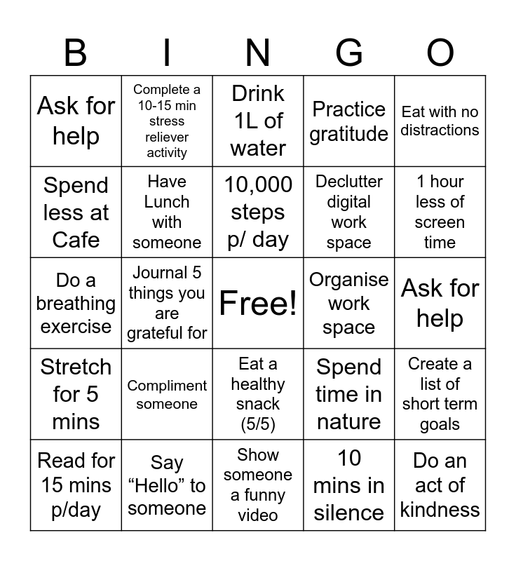 This bingo card has a free space and 24 words: Compliment someone, Say “Hello” to someone, 10,000 steps p/ day, Read for 15 mins p/day, Eat with no distractions, Ask for help, Spend less at Cafe, Complete a 10-15 min stress reliever activity, Organise work space, Eat a healthy snack (5/5), Declutter digital work space, Do a breathing exercise, Spend time in nature, Create a list of short term goals, Have Lunch with someone, 10 mins in silence, Ask for help, Drink 1L of water, 1 hour less of screen time, Journal 5 things you are grateful for, Do an act of kindness, Stretch for 5 mins, Practice gratitude and Show someone a funny video.