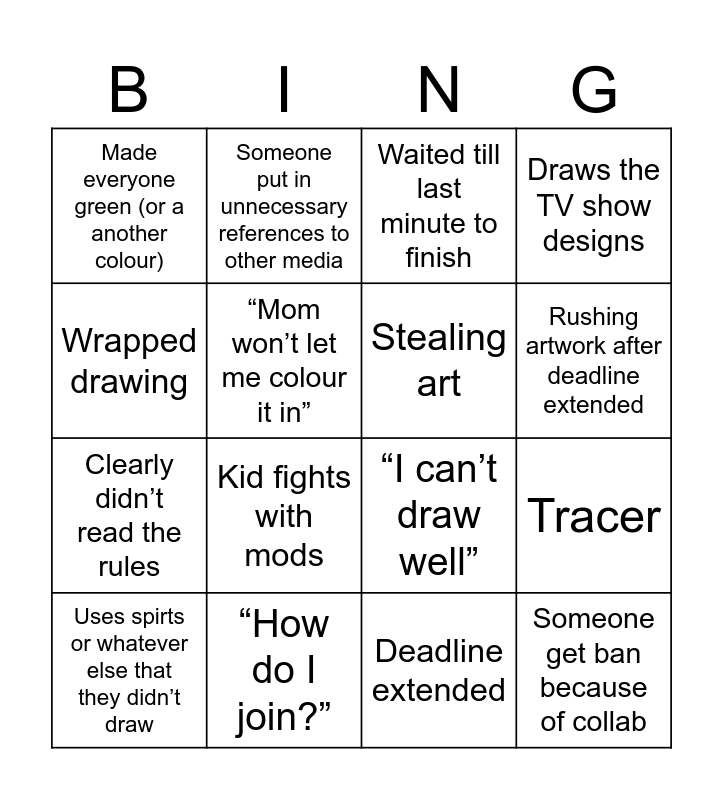 This bingo card has 16 words: “How do I join?”, Tracer, Waited till last minute to finish, Made everyone green (or a another colour), Clearly didn’t read the rules, Someone put in unnecessary references to other media, “I can’t draw well”, Deadline extended, Wrapped drawing, “Mom won’t let me colour it in”, Uses spirts or whatever else that they didn’t draw, Draws the TV show designs, Kid fights with mods, Rushing artwork after deadline extended, Stealing art and Someone get ban because of collab.