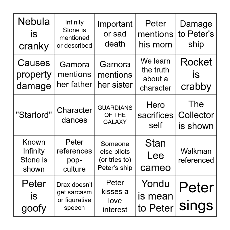 This bingo card has a free space and 27 words: Stan Lee cameo, Hero is shirtless or bare-chested*, We learn the truth about a character, Peter kisses a love interest, Causes property damage, Important or sad death, Infinity Stone is mentioned or described, Known Infinity Stone is shown, Hero sacrifices self, Walkman referenced, "Starlord", Peter mentions his mom, Peter is goofy, Drax doesn't get sarcasm or figurative speech, Rocket is crabby, Groot is dumb, Gamora mentions her father, Gamora mentions her sister, Peter references pop-culture, Nebula is cranky, The Collector is shown, Yondu is mean to Peter, Character dances, Peter sings, Someone else pilots (or tries to) Peter's ship, Damage to Peter's ship and Rocket fixes, builds, or tinkers something.