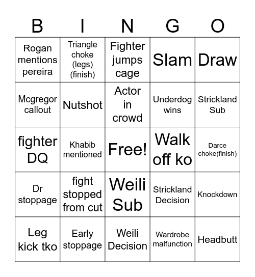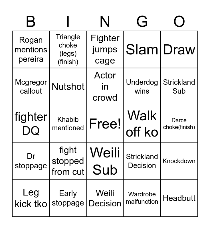 This bingo card has a free space and 62 words: Eyepoke, Early stoppage, Double leg, Dr stoppage, Injury, 3 fouls in one fight, Nutshot, cutman tate spotted, Underdog wins, Spinning attack, Slam, Fight announced during card, Mcgregor callout, Family in octagon win, Late stoppage, Rogan mentions pereira, Headbutt, Draw, Headkick, Actor in crowd, Walk off ko, Fighter jumps cage, Leg kick tko, Wardrobe malfunction, Point deduction, Armbar(finish), Gnp finish, Heel hook(finish), Knockdown, Loser interview, Guillotine(finish), Arm triangle(finish), Twister(finish), Kimura finish (finish), Darce choke(finish), Triangle choke (legs)(finish), RnC (finish), Fighter unconscious, Khabib mentioned, mouthpiece fall out, fighter DQ, callout on mic(anyone), fight stopped from cut, Strickland ko/tko, Strickland Sub, Strickland Decision, Dricus Ko/Tko, Dricus Sub, Dricus Decision, Weili Ko/Tko, Weili Sub, Weili Decision, Suarez Ko/Tko, Suarez Sub, Suarez Decision, Fight breaks out in the crowd, Fighter says a slur during interview, Khamzat in cage, Khamzat in crowd, Khamzat mentioned, Tuivasa spotted and Possible shoey (tai most likely).