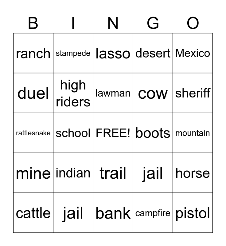 This bingo card has a free space and 49 words: Boston, pistol, stagecoach, bank, indian, cowboys, stampede, California, duel, hat, high riders, desert, horse, jail, mine, gunfighter, lawman, boots, railroad, Mexico, school, campfire, ranch, cow, gold, sheriff, cattle, leather, trail, mine, saddle, plain, canyon, outlaw, jail, saloon, train, herd, mountain, canyon, creek, wagon, stallion, rope, rattlesnake, lasso, spurs, Johnny and Scott.