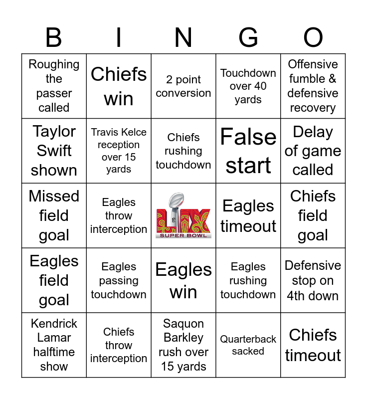 This bingo card has a free space and 25 words: Chiefs passing touchdown, Eagles passing touchdown, False start, Defensive stop on 4th down, Taylor Swift shown, 2 point conversion, Touchdown over 40 yards, Offensive fumble & defensive recovery, Eagles throw interception, Delay of game called, Eagles field goal, Chiefs rushing touchdown, Quarterback sacked, Chiefs field goal, Missed field goal, Chiefs throw interception, Eagles rushing touchdown, Roughing the passer called, Travis Kelce reception over 15 yards, Saquon Barkley rush over 15 yards, Eagles timeout, Chiefs timeout, Kendrick Lamar halftime show, Chiefs win and Eagles win.