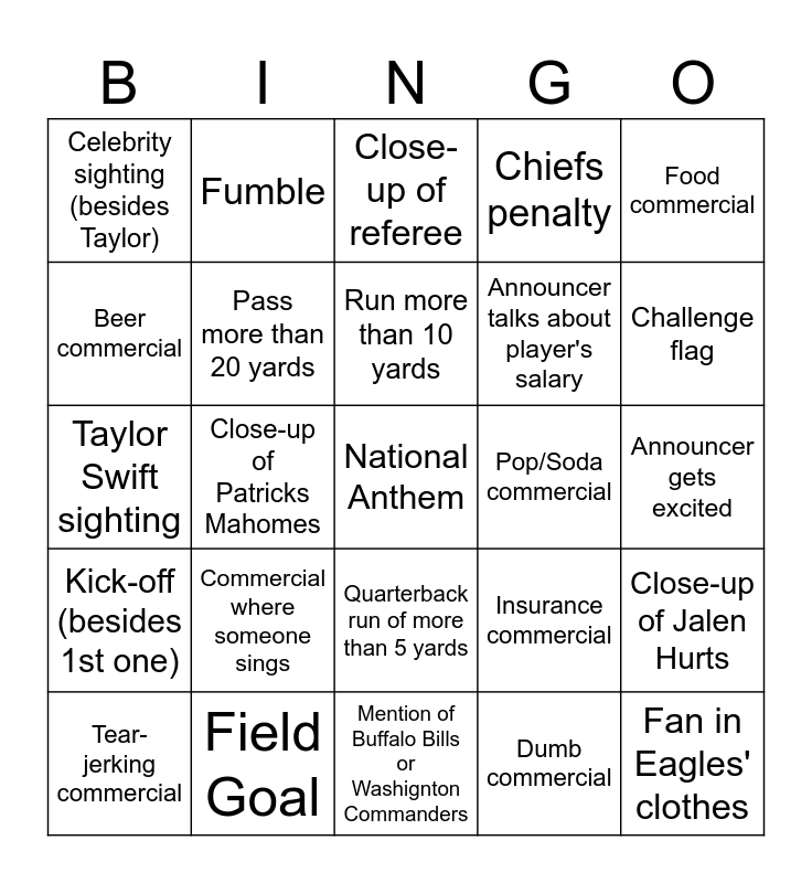 This bingo card has a free space and 35 words: Eagles penalty, Fan in Chiefs' clothes, Car commercial, Pass more than 20 yards, Quarterback run of more than 5 yards, Chiefs penalty, Beer commercial, Funny commercial, Run more than 10 yards, Sack, Taylor Swift sighting, Food commercial, Close-up of football, Touch-down, Celebrity sighting (besides Taylor), Pop/Soda commercial, Dumb commercial, Close-up of Patricks Mahomes, Kick-off (besides 1st one), Fan in Eagles' clothes, Insurance commercial, Tear-jerking commercial, Close-up of Jalen Hurts, Field Goal, Close-up of referee, Challenge flag, Bad call, Water bottle on camera, Announcer talks about player's salary, Announcer gets excited, Mention of New England Patriots, Mention of Buffalo Bills or Washignton Commanders, Commercial where someone sings, Fumble and Inter-ception.