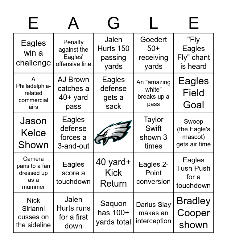 This bingo card has a free space and 24 words: Eagles score a touchdown, Jalen Hurts runs for a first down, Eagles defense gets a sack, Nick Sirianni cusses on the sideline, "Fly Eagles Fly" chant is heard, Eagles win a challenge, A Philladelphia-related commercial airs, Penalty against the Eagles' offensive line, Taylor Swift shown 3 times, 40 yard+ Kick Return, An "amazing white" breaks up a pass, Jason Kelce Shown, Eagles 2-Point conversion, Eagles Tush Push for a touchdown, AJ Brown catches a 40+ yard pass, Darius Slay makes an interception, Swoop (the Eagle's mascot) gets air time, Jalen Hurts 150 passing yards, Eagles Field Goal, Eagles defense forces a 3-and-out, Bradley Cooper shown, Camera pans to a fan dressed up as a mummer, Goedert 50+ receiving yards and Saquon has 100+ yards total.