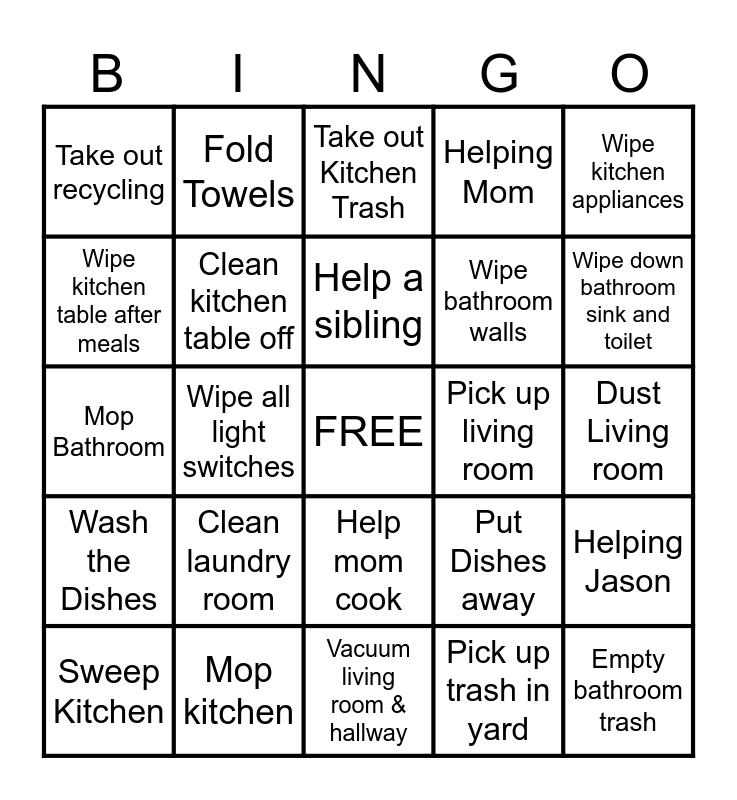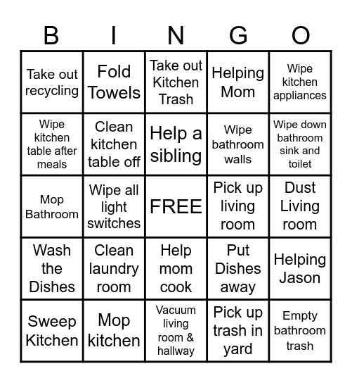 This bingo card has a free space and 29 words: Sweep Kitchen, Clean hallway Baseboards & walls, Wipe all light switches, Sweep Bathroom, Take out recycling, Take out Kitchen Trash, Clean kitchen table off, Clean laundry room, Pick up living room, Mop kitchen, Dust Living room, Empty bathroom trash, Vacuum living room & hallway, Pick up trash in yard, Wipe down bathroom sink and toilet, Wash and dry your laundry, Help mom cook, Wash the Dishes, Wipe kitchen appliances, Mop Bathroom, Put Dishes away, Put groceries Away, Wipe bathroom walls, Wipe kitchen table after meals, Helping Mom, Fold Towels, Helping Jason, Help a sibling and Doing something with out having to be told.