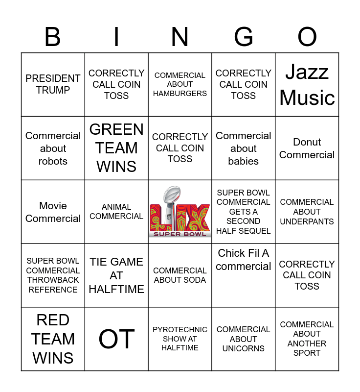 This bingo card has a free space and 29 words: RED TEAM WINS, JURASSIC PARK COMMERCIAL, ANIMAL COMMERCIAL, NATIONAL ANTHEM, PRESIDENT TRUMP, COMMERCIAL ABOUT HAMBURGERS, GREEN TEAM WINS, TIE GAME AT HALFTIME, SUPER BOWL COMMERCIAL GETS A SECOND HALF SEQUEL, OT, COMMERCIAL ABOUT UNDERPANTS, COMMERCIAL ABOUT ANOTHER SPORT, PYROTECHNIC SHOW AT HALFTIME, COMMERCIAL ABOUT UNICORNS, Donut Commercial, Candy Commercial, COMMERCIAL ABOUT SODA, SUPER BOWL COMMERCIAL THROWBACK REFERENCE, Jazz Music, Movie Commercial, Chick Fil A commercial, Football player gets hurt, Commercial about babies, Commercial about robots, CORRECTLY CALL COIN TOSS, CORRECTLY CALL COIN TOSS, CORRECTLY CALL COIN TOSS, CORRECTLY CALL COIN TOSS and CORRECTLY CALL COIN TOSS.