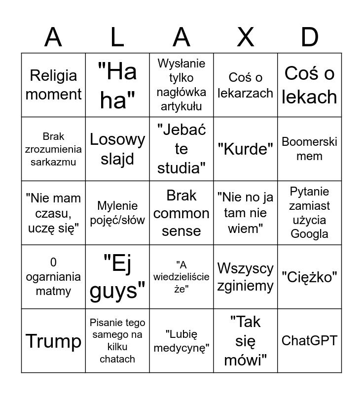 This bingo card has a free space and 25 words: "Ej guys", "Lubię medycynę", "Jebać te studia", Trump, Coś o lekach, Religia moment, Brak zrozumienia sarkazmu, "Ha ha", "Nie no ja tam nie wiem", "A wiedzieliście że", "Kurde", "Nie mam czasu, uczę się", Wszyscy zginiemy, "Ciężko", Losowy slajd, Emoji chatu, Pytanie zamiast użycia Googla, Wysłanie tylko nagłówka artykułu, Boomerski mem, Mylenie pojęć/słów, ChatGPT, Pisanie tego samego na kilku chatach, 0 ogarniania matmy, Coś o lekarzach and "Tak się mówi".