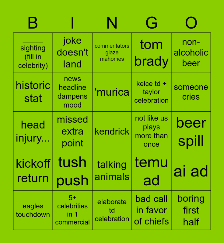 This bingo card has a free space and 29 words: eagles touchdown, chiefs touchdown, missed extra point, safety, _____ sighting (fill in celebrity), commentators glaze mahomes, news headline dampens mood, tush push, not like us plays more than once, 5+ celebrities in 1 commercial, beer spill, boring first half, elaborate td celebration, bad call in favor of chiefs, someone cries, it's always sunny, talking animals, kickoff return, non-alcoholic beer, head injury..., temu ad, puppy bowl, kelce td + taylor celebration, historic stat, tom brady, joke doesn't land, ai ad, 'murica and someone commits faux pas.