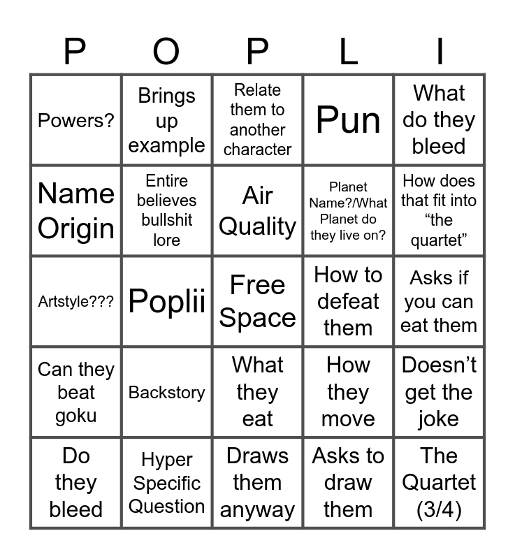 This bingo card has a free space and 24 words: Backstory, Hyper Specific Question, Air Quality, Do they bleed, What do they bleed, Powers?, Name Origin, Brings up example, How to defeat them, What they eat, Planet Name?/What Planet do they live on?, Artstyle???, How they move, Doesn’t get the joke, Entire believes bullshit lore, Asks to draw them, Asks if you can eat them, Relate them to another character, How does that fit into “the quartet”, Poplii, The Quartet (3/4), Can they beat goku, Pun and Draws them anyway.